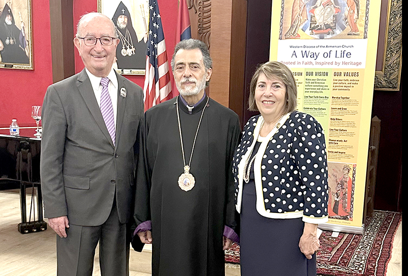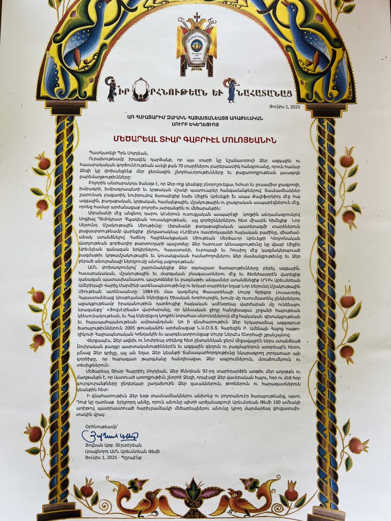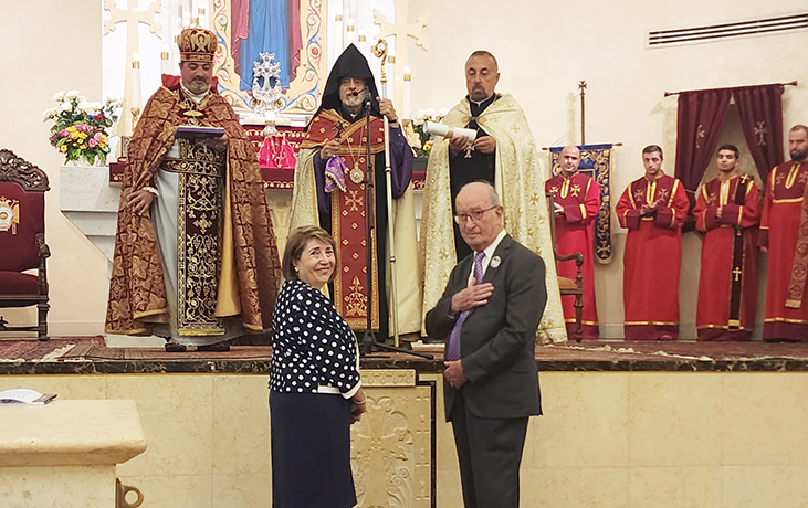 Indeed, in that letter, the Archbishop emphasized, “Your entire life is characterized by the honorable stature of a skilled and enlightened journalist, editor, and educational worker. For decades, you served with exceptional dedication, first in the Middle East and then in California, in the political, educational, community, cultural, and journalistic spheres of the Armenian nation, for which you earned the respect and admiration of us all. In Lebanon, with other partners, you founded the Nor Serount Cultural Association. Upon moving to the United States, you continued to bring your useful services to the national, social, educational, and cultural spheres and skillfully held various responsible positions. You assumed the presidency of the Western United States Executive Committee of the SDHP many times. For many years, you were the Chairman of the Nor Serount Cultural Association. In 1984, with the support of a group of friends, you made a dream of having an Armenian daily school, the “Hovsepian” school, a reality, which became the lifeblood of the Armenian community in the region and, alongside the Armenian Church, of strengthening Armenian consciousness and the preservation of Armenian identity among the younger generations. In appreciation of your long-standing service to the nation, in 2005, you were awarded the Pontifical Decree of His Holiness Karekin II, Catholicos of All Armenians, and were awarded the Order of Saint Nerses.